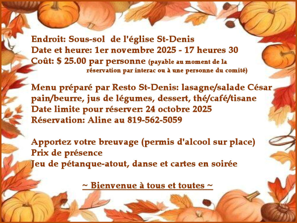Veuillez prendre note que le menu annoncé lors du souper d'octobre dernier est cancellé et sera remplacé par le menu indiqué plus bas et préparé par le Resto St-Denis