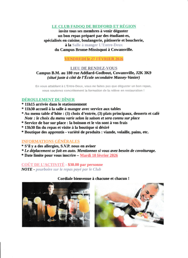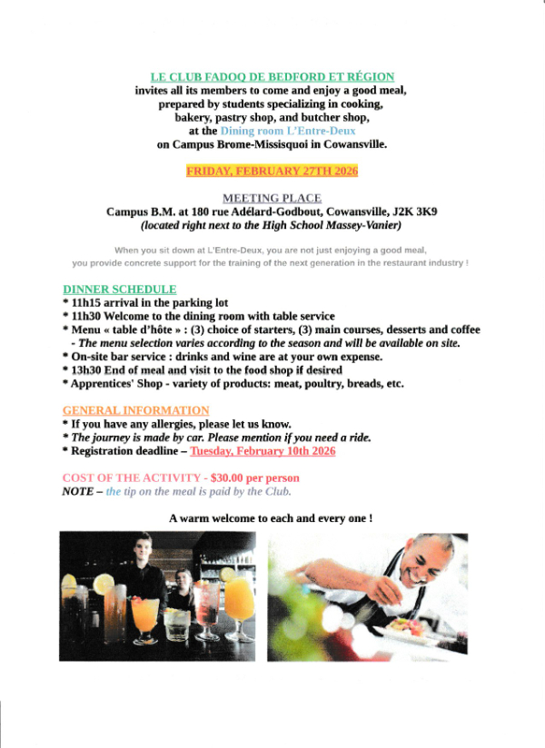 Vous devez confirmer votre présence la semaine précédant l'événement, à l'adresse suivante: info@bedford.fadoqry.ca