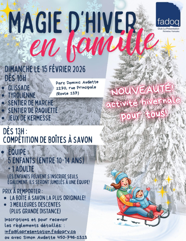 Pour toute question ou demande d’information supplémentaire, veuillez communiquer avec le club FADOQ La Présentation à l’adresse suivante info@lapresentation.fadoqry.ca ou par téléphone au 450 796-5129