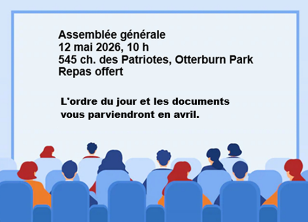J’espère vous rencontrer en grand nombre le 12 mai prochain à 10h00, au local de la FADOQ, 545 chemin des Patriotes, Otterburn Park.