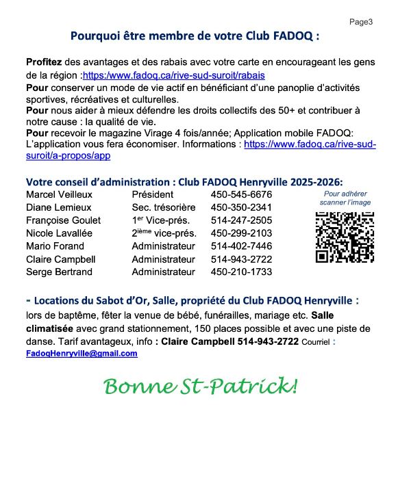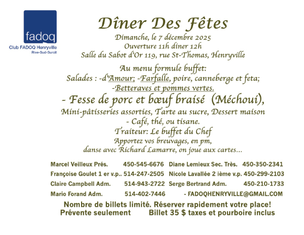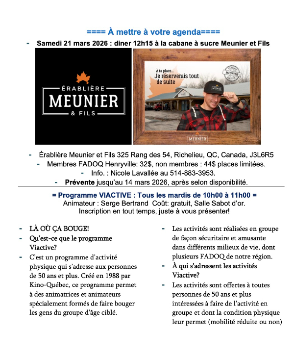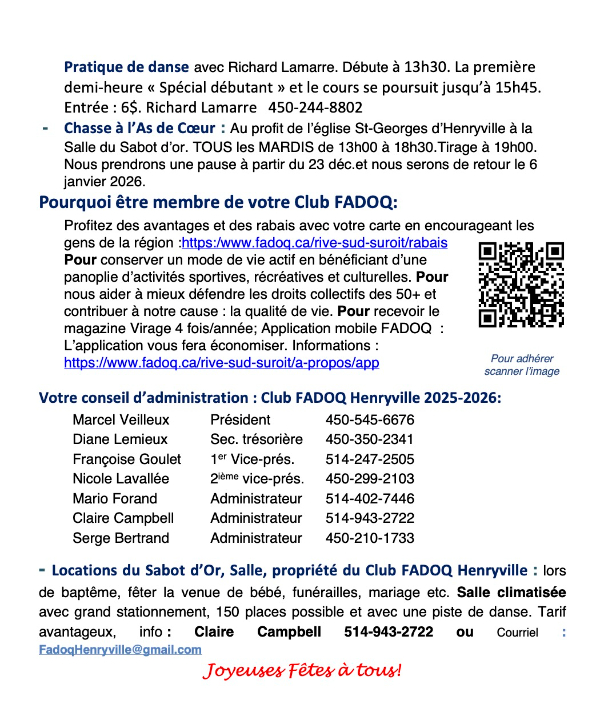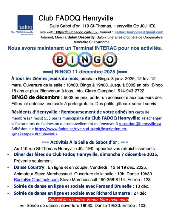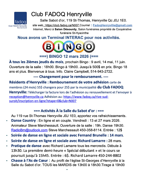 Locations du sabot d’or, Salle propriété du club FADOQ Henryville : lors de baptême, fêter la venue de bébé, funérailles, mariage etc. Salle climatisée avec grand stationnement 150 places possible et avec une piste de danses. Inclus cuisine et vestiaire, avec rampe d'accès pour handicapé et salle de bain adaptée et table à langer. Tarif avantageux Info Claire Campbell Administrateur 514-943-2722 ou FadoqHenryville@gmail.com