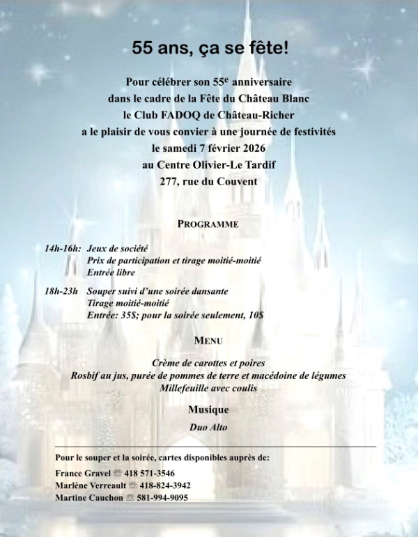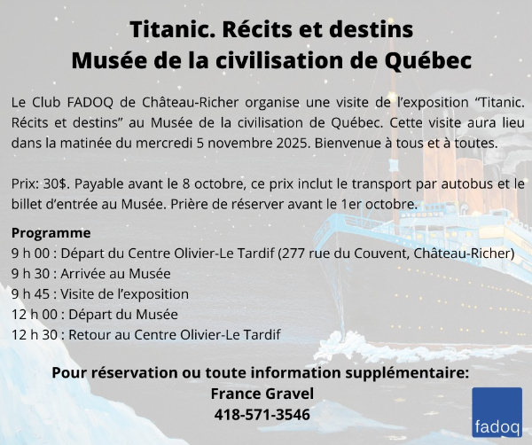 Quel que soit le moyen choisi, il est important de préciser le nom et le numéro de votre club local: Club FADOQ de Château-Richer, numéro T015.