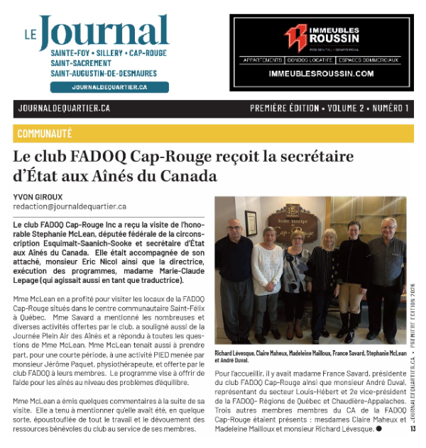Le jeudi 22 janvier 2026, le Club FADOQ Cap-Rouge, . recevait la visite de l’Honorable Stephanie McLean.