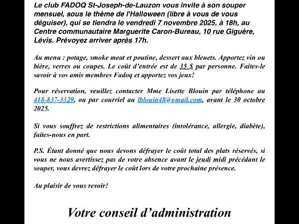 au 418-837-3329, ou courriel lblouin48@gmail.com une semaine avant l'activité. À chacun de nos soupers nous avons un thème différent, libre à vous d'y participer. Cependant plusieurs membres y participent ce qui crée une ambiance agréable lors de nos soupers.