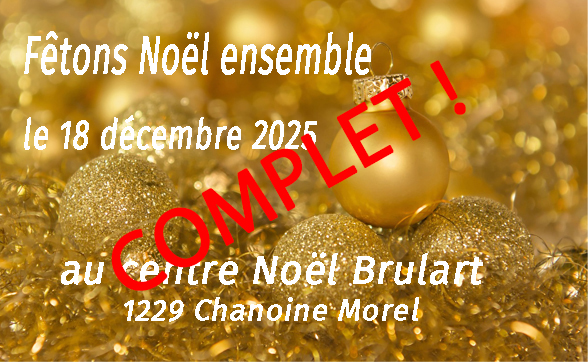 Je dois vous avouer que la popularité de nos activités s’accroît d’année en année. Prenons pour exemple notre repas de Noël qui a affiché complet après une seule période d’inscription. C’est une première et démontre l’importance d’agir rapidement si on veut s’assurer une place.