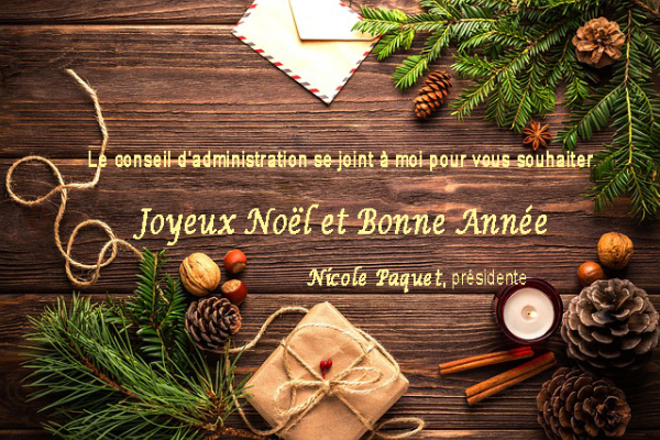 2026 est maintenant à nos portes. Vos administrateurs sont à finaliser la programmation d’Hiver. Celle-ci sera sur votre site WEB sous peu. En plus de nos ateliers, nos conférences et nos déjeuners mensuels seront à nouveau au programme et des sorties (Saint-Valentin, cabane à sucre et autres) sont en préparation. Nous anticipons vous offrir, pour cette nouvelle année, des moments agréables à partager.