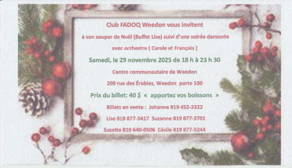 Une activité spéciale aura lieu le lundi 17 novembre à 10h00 pour les membres de FADOQ Weedon. SVP veuillez arriver pour 09h30.