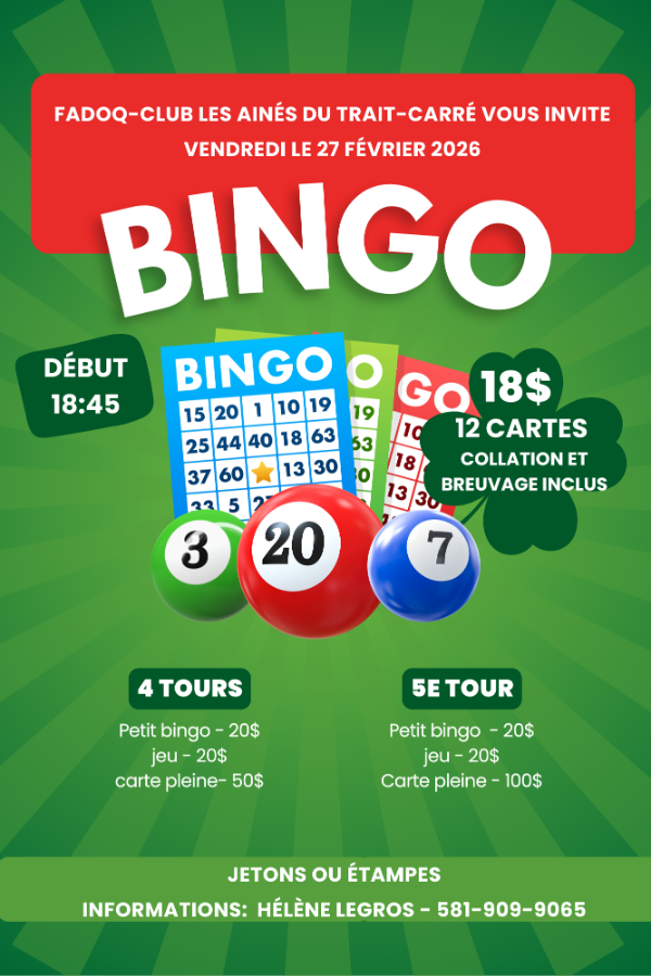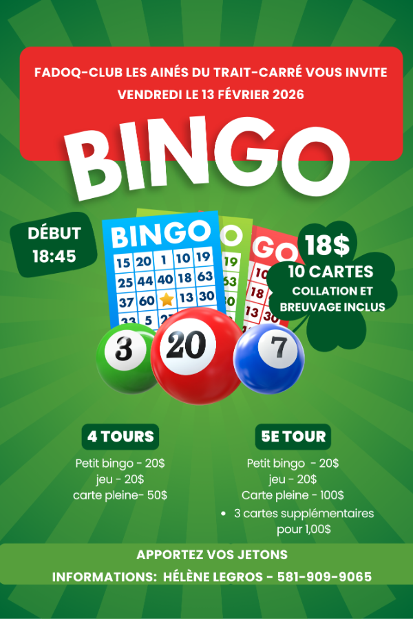 Nouvelle activité pour tous. A la demande générale, votre club offrira des soirées de bingo dès le 30 janvier prochain.